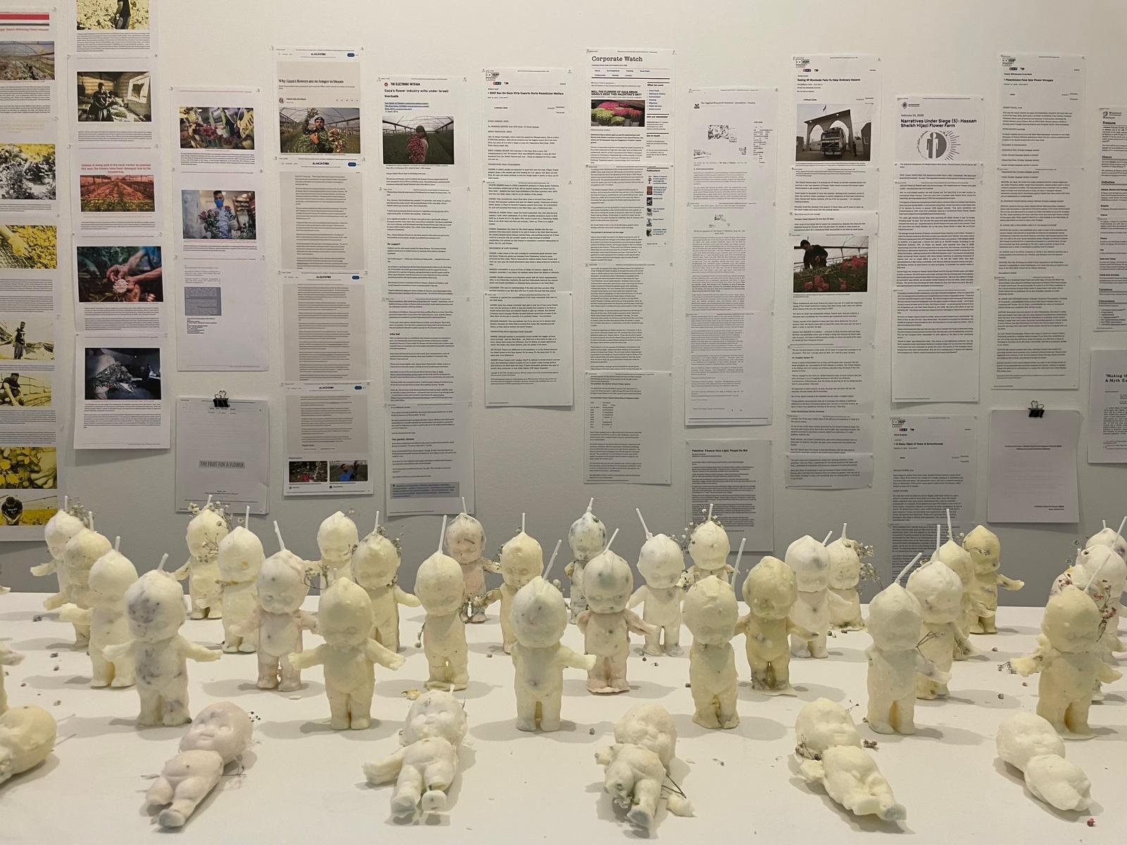 The Gorgeous Flowers Have a Smell is a solo installation by Mexican American artist Paloma Mayorga. It is composed of wax doll figurines embedded with baby’s breath flowers, paired with printed online articles documenting the global impact of one particular flower company.