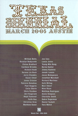 | Artists William Betts (Houston) Rosalyn Bodycomb (Dallas) Elaine Bradford (Alice) Candace Briceño (Cedar Creek) Richard Budd (San Antonio) Serena Lin Bush (Houston) Jerry Chamkis (Austin) Susan Cheal (Denton) Jonas Criscoe (Austin) Patricia Donahue (San Antonio) Peat Duggins (Austin) Celia Eberle (Ennis) Chris Ferebee (Houston) Ali Fitzgerald (Austin) Heyd Fontenot (Austin) Faith Gay (Austin) Christine Gray (Austin) Matthew Guest (McAllen) Joe Ives (Houston) Lance Jones (Dallas) Young-Min Kang (Austin) Barna Kantor (Austin) Jimmy Kuehnle (San Antonio) Janaki Lennie (Houston) Jason Makepeace (Houston) Jonathan Marshall (Austin) Richard Martinez (San Antonio) Seth Mittag (Houston) Mari Omori (Spring) Nina Rizzo (Austin) Matthew Rodriguez (Austin) Annie Simpson (San Marcos) Charlotte Smith (Dallas) Debra Sugarman (Austin) Daniel Tackett (Paige) |